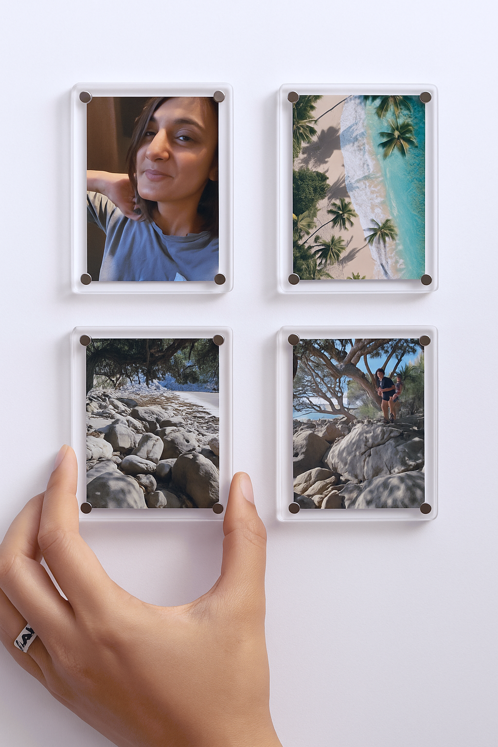 Give your fridge, locker, or workspace a fresh look every day with our Custom Acrylic Photo Magnets. Featuring a clear acrylic frame with a magnetic backing, each magnet lets you slide in a new photo or image whenever you like—no fuss, just endless personalization.