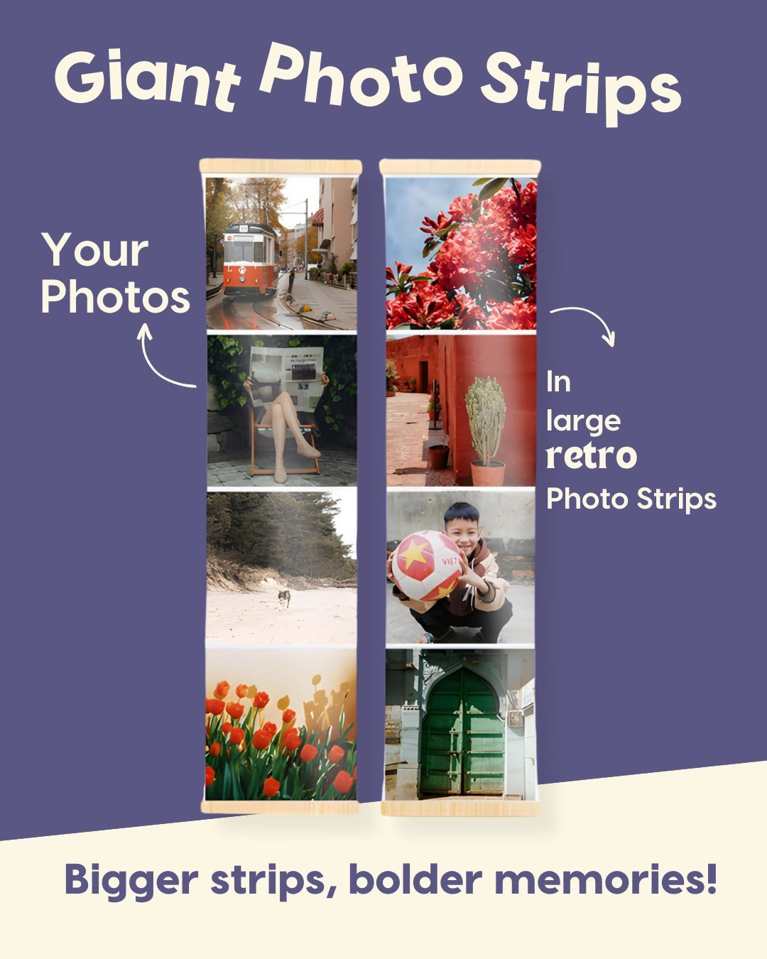 Giant Photo Strips are large, customizable photo displays that feature a series of photos in a strip format. Perfect for creating a statement piece or a unique gift, these strips allow you to showcase multiple images in a visually impactful way.