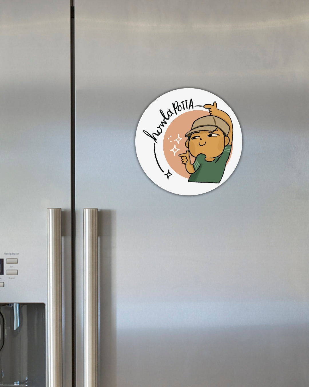 Stick some Hyderabadi attitude right onto your fridge! The Howla Potta magnet is cheeky, fun, and a daily reminder of your inner hero. Buy the Howla Potta design as badge, magnet or 2-in-1 magnet + bottle opener.