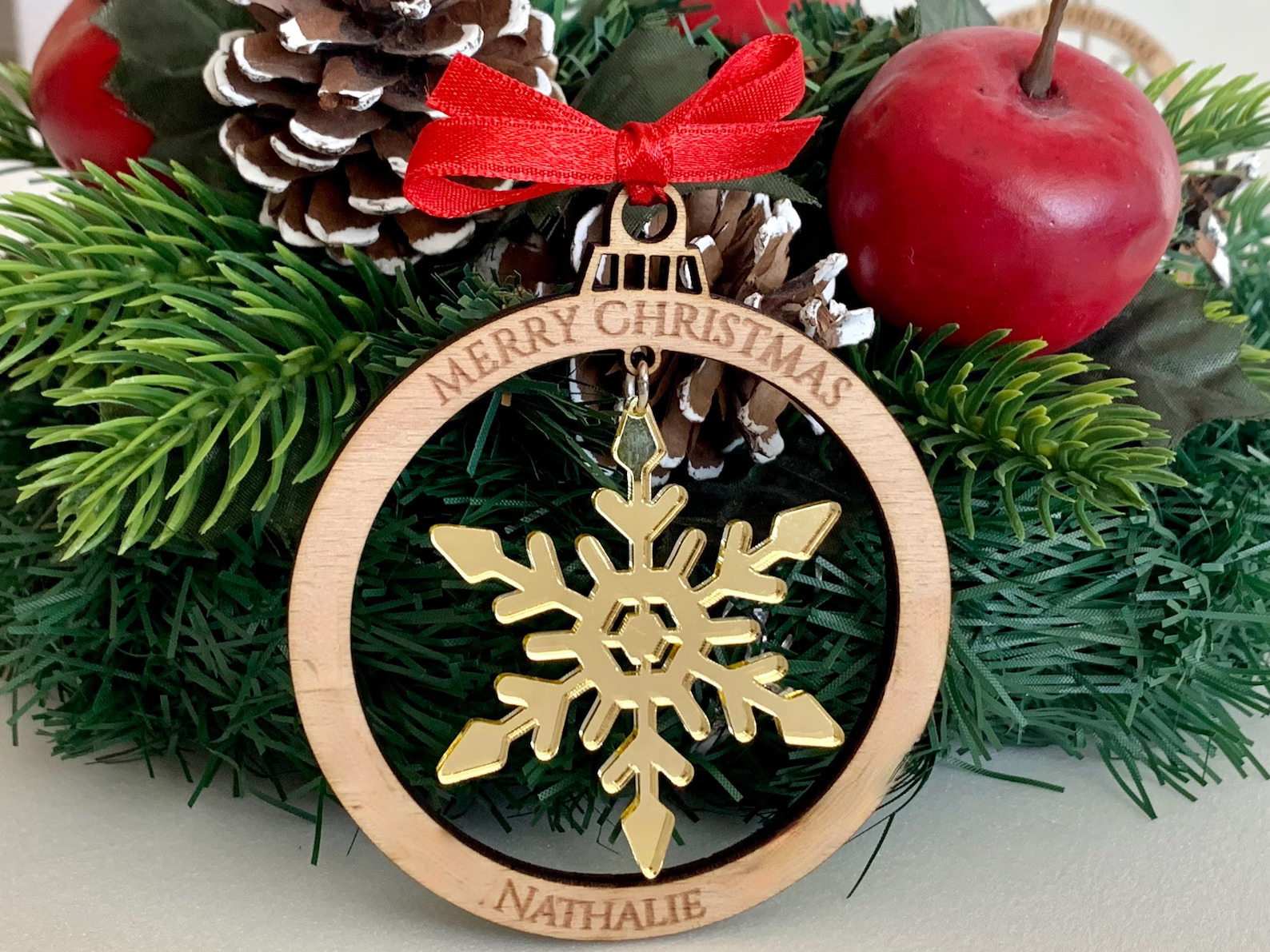 Celebrate the beauty of winter with our Magical Snowflake Ornaments! Made of delicate acrylic snowflakes framed within a wooden ring, these ornaments offer a magical touch to your Christmas décor. Customizable with names, they’re the perfect blend of elegance and personalization to make your festive season truly special.