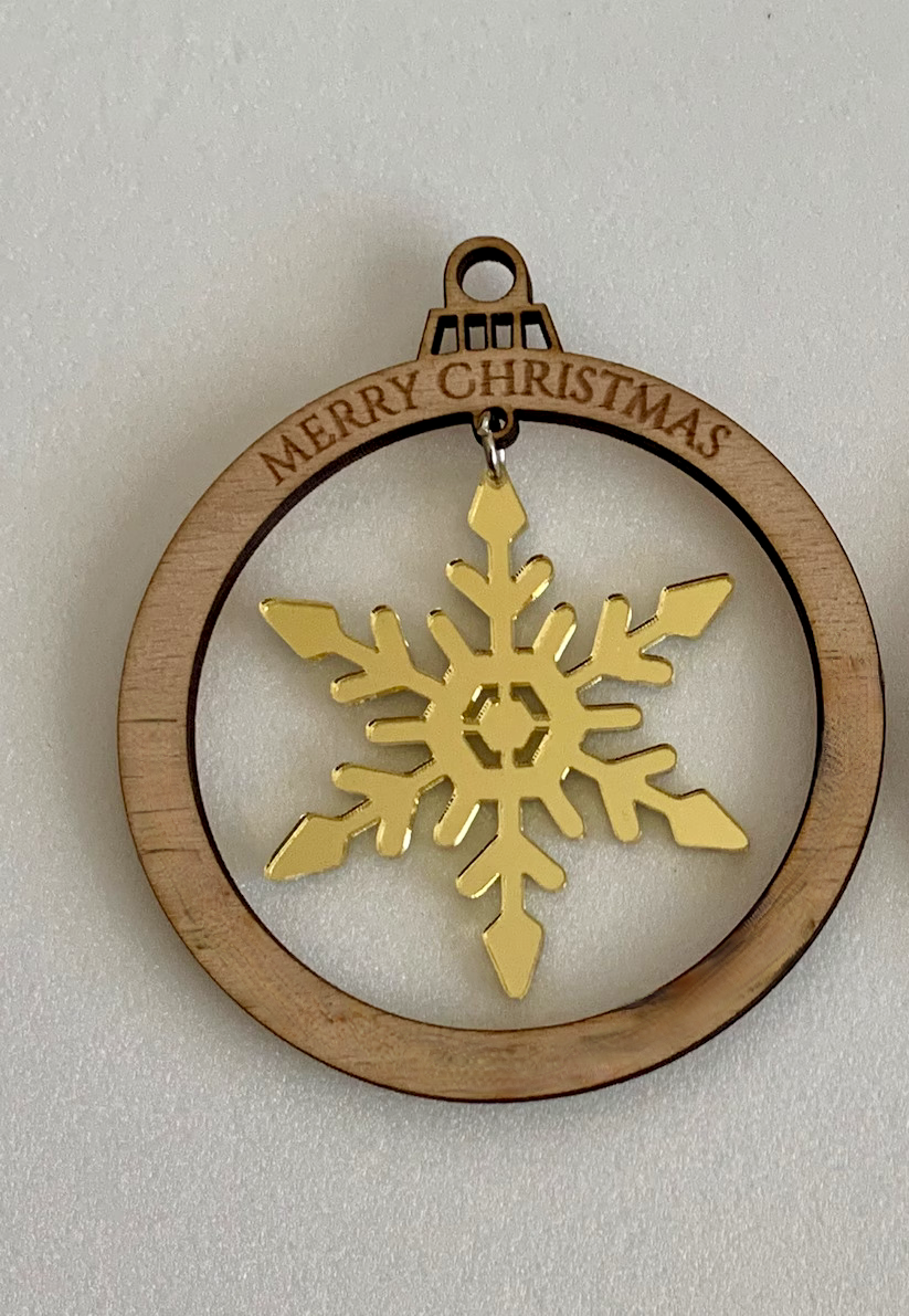The ornaments are crafted from high-quality acrylic snowflakes and rustic wooden rings.