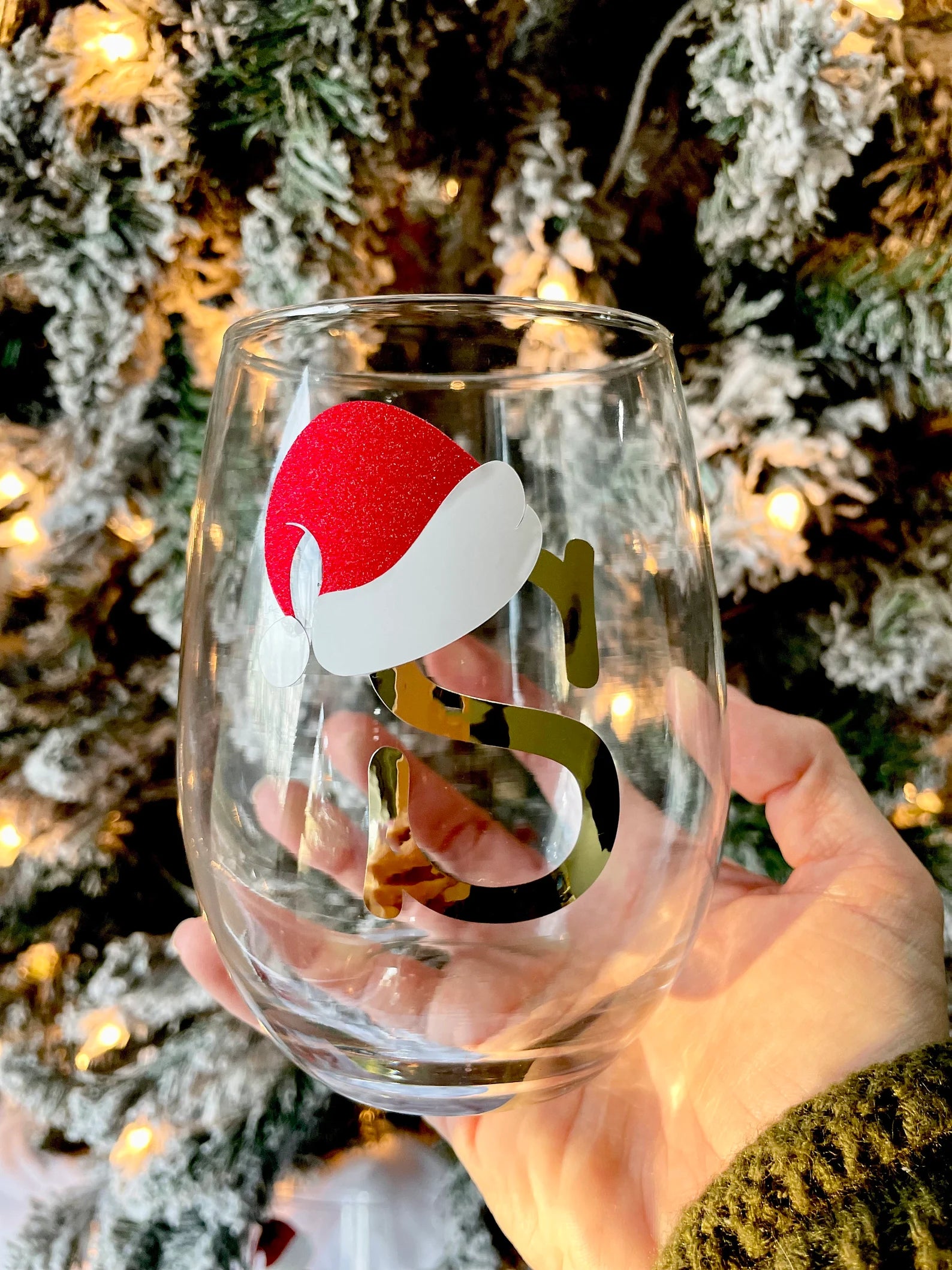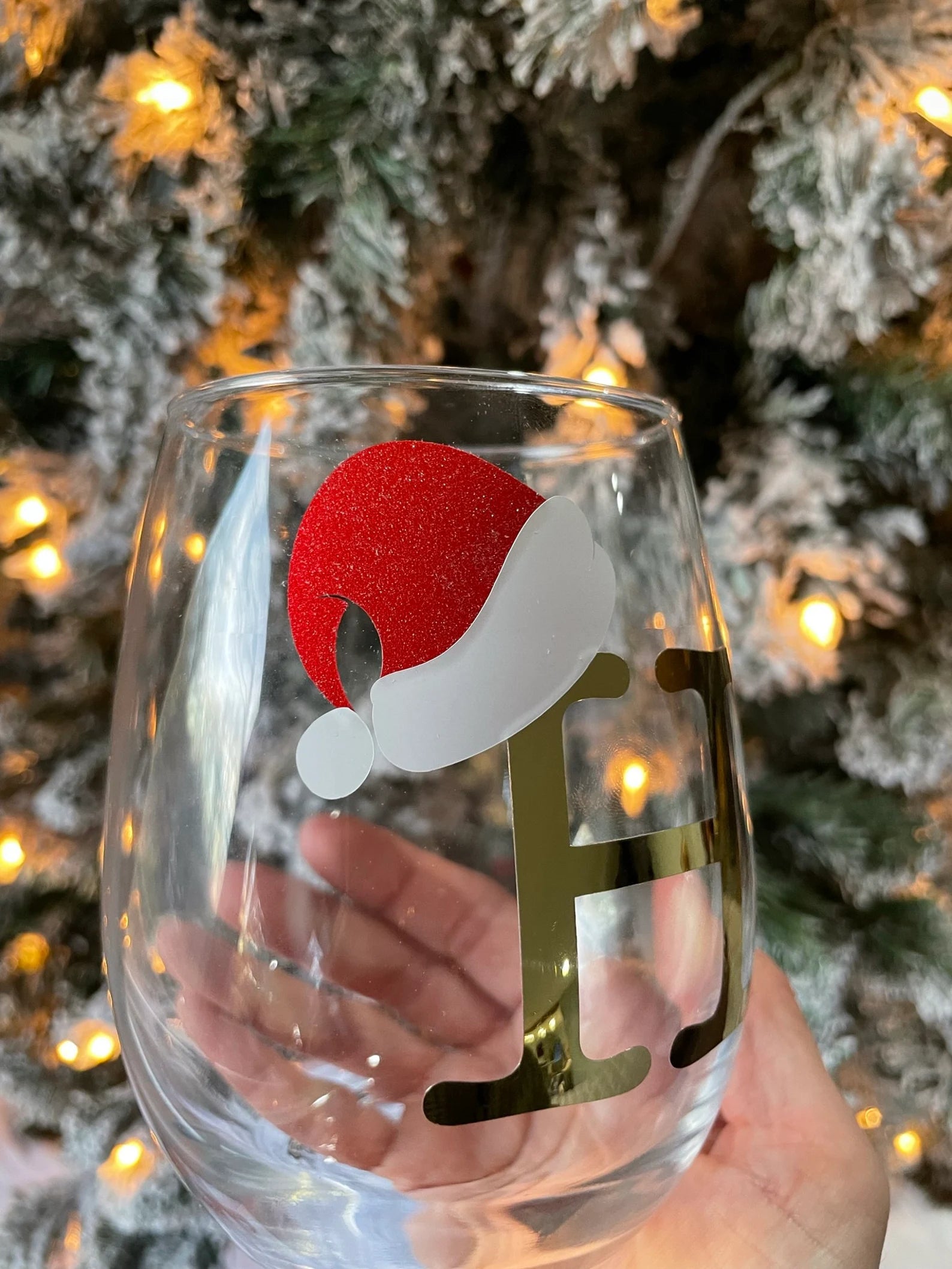 The Santa hat design is a festive touch added to the alphabet on the wine glass, bringing in the Christmas spirit.