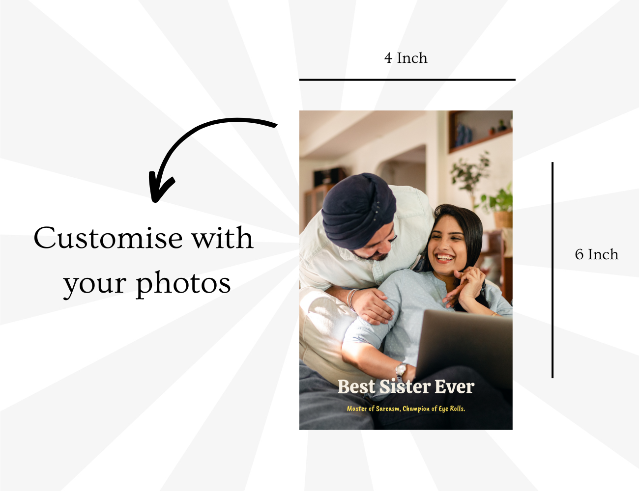 - 4 inch by 6 inch with Gloss Finish. Personalise with your photo