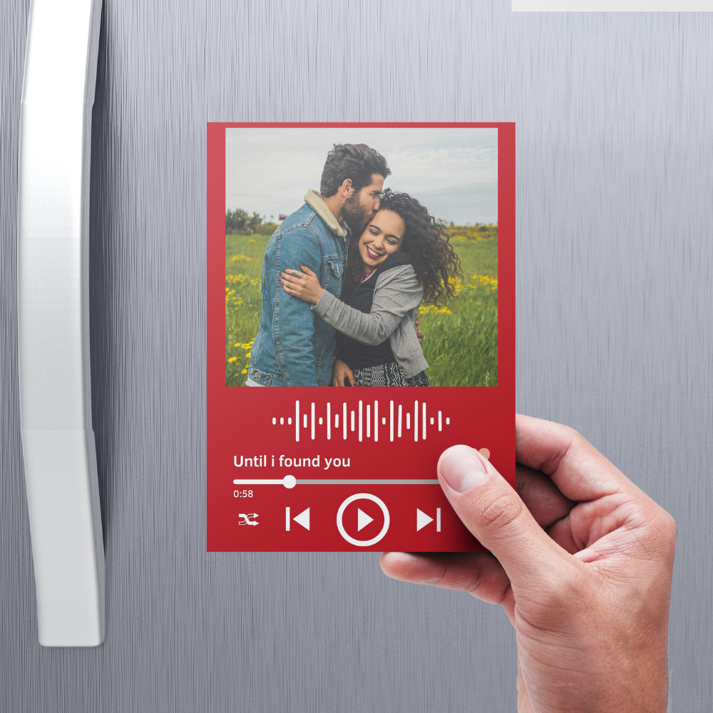 Dedicate your favorite song and your favorite memory with your loved one on Valentine's Day with a personal photo and barcode of the song on the magnet. Create a one-of-a-kind display on their fridge, locker or any magnetic surface that they can look back on and cherish forever. Just enter the title, album or song link and Your picture to customize. We add a Spotify scannable barcode to your Magnet which you can scan it to play song on your Spotify app by default. These Magnets can be a gift to your friends or special someone. Every walk to the fridge is a memorable on now with custom Spotify Magnet