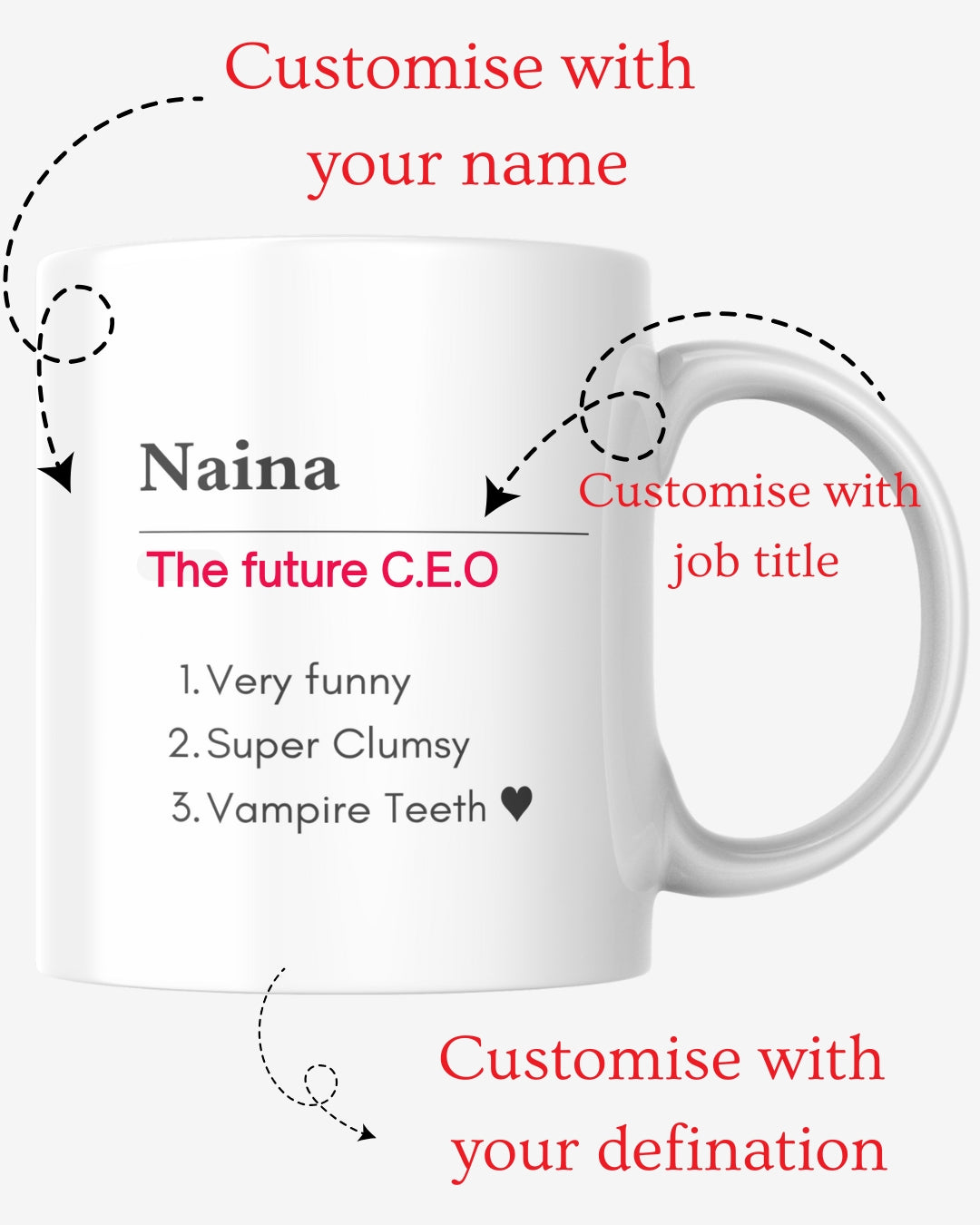 It's a fully personalized mug where you can add your name, a career or personality-based tagline, and a unique definition to describe yourself or someone you love.