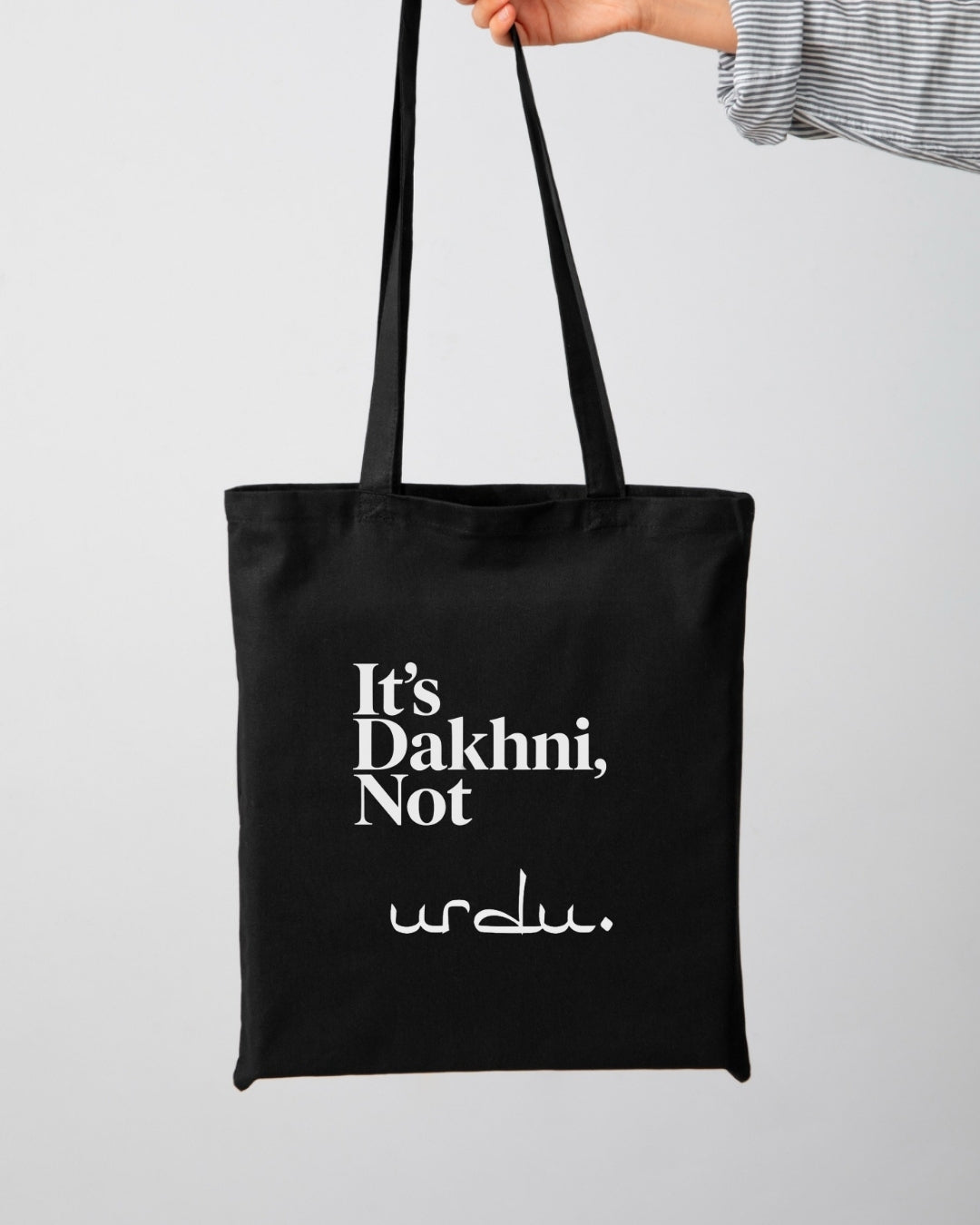 - This tote bag celebrates Hyderabadi heritage—Dakhni, the warm-hearted language that blends Urdu, Hindi, Telugu, and Marathi.