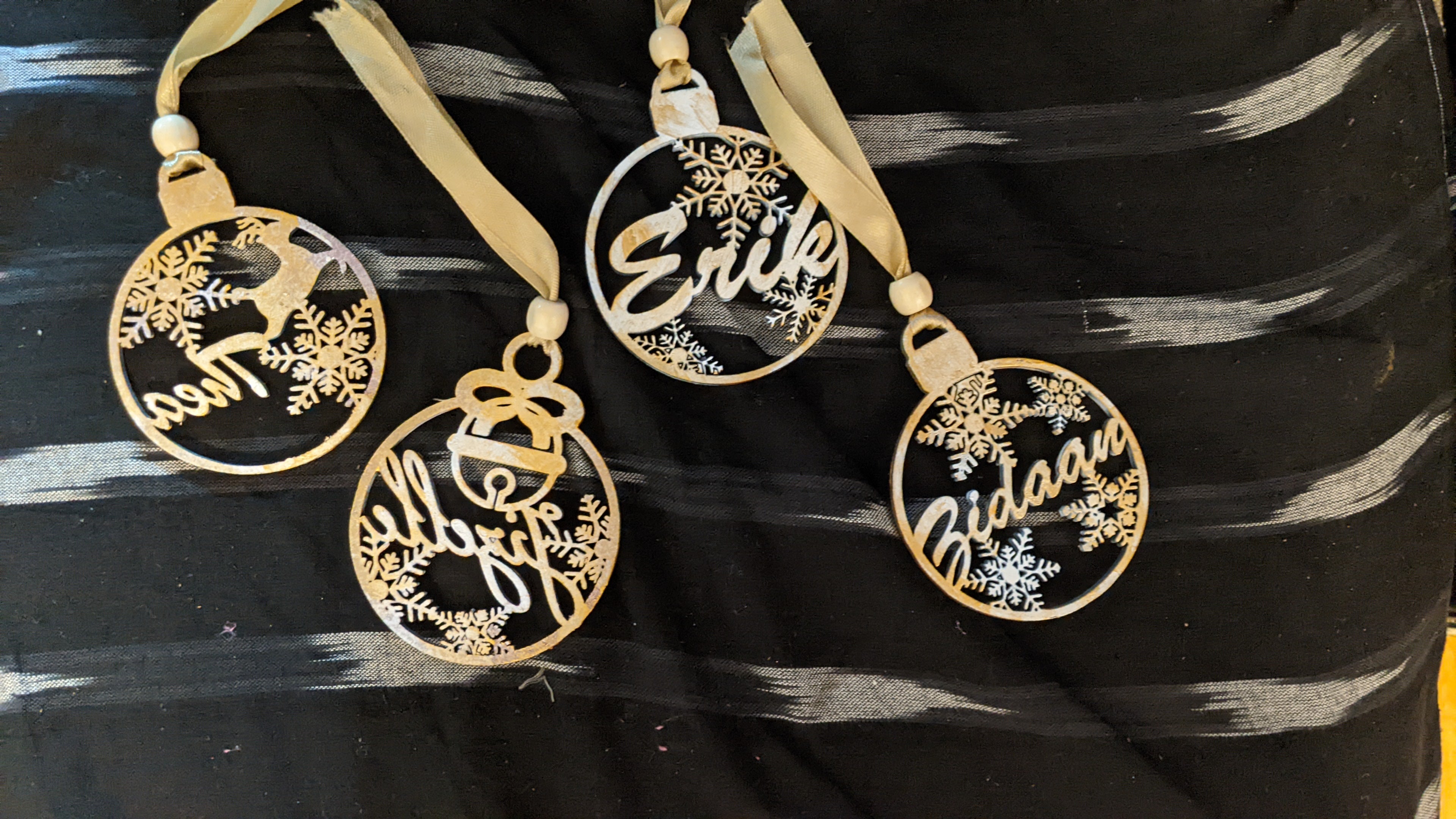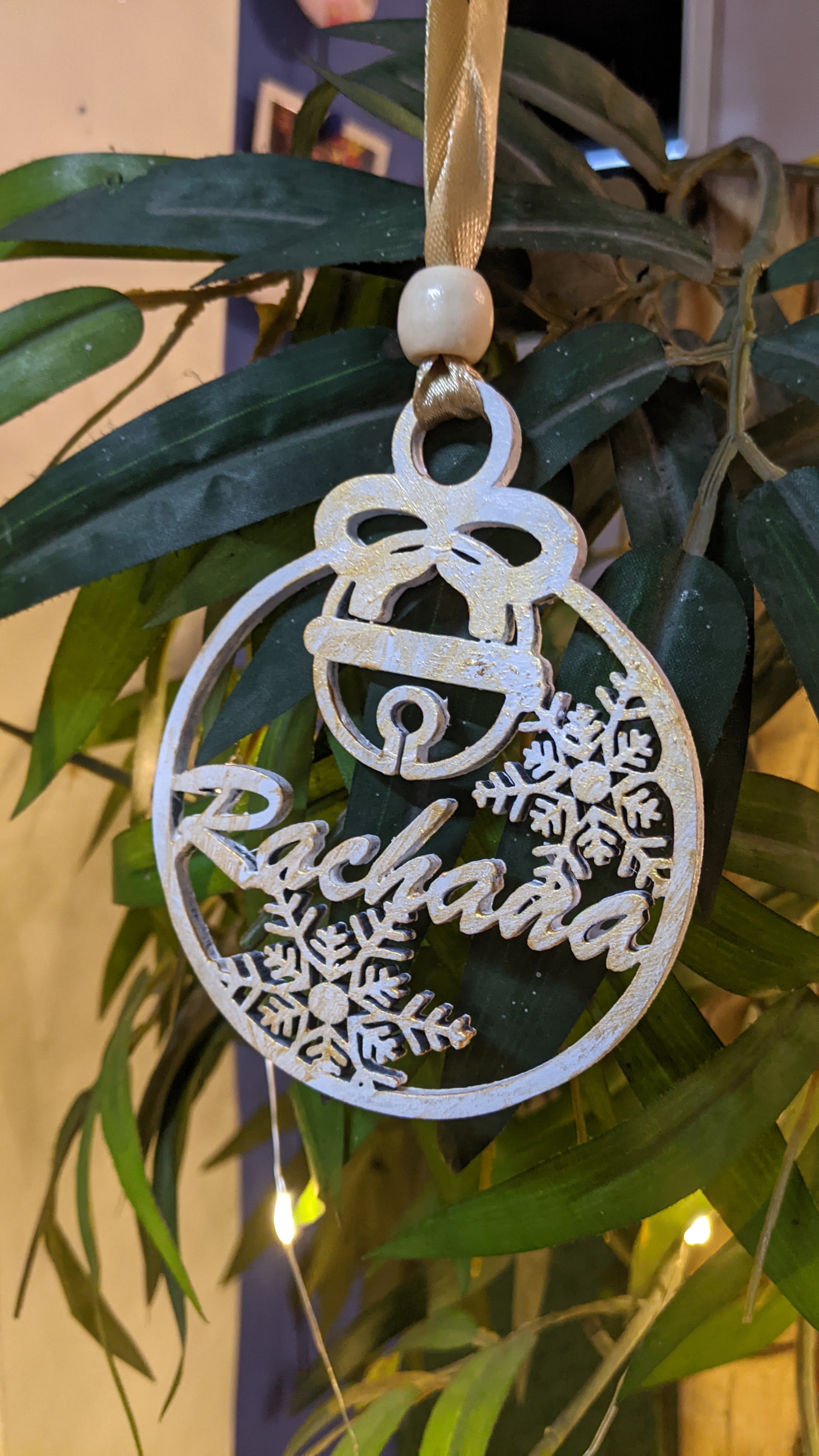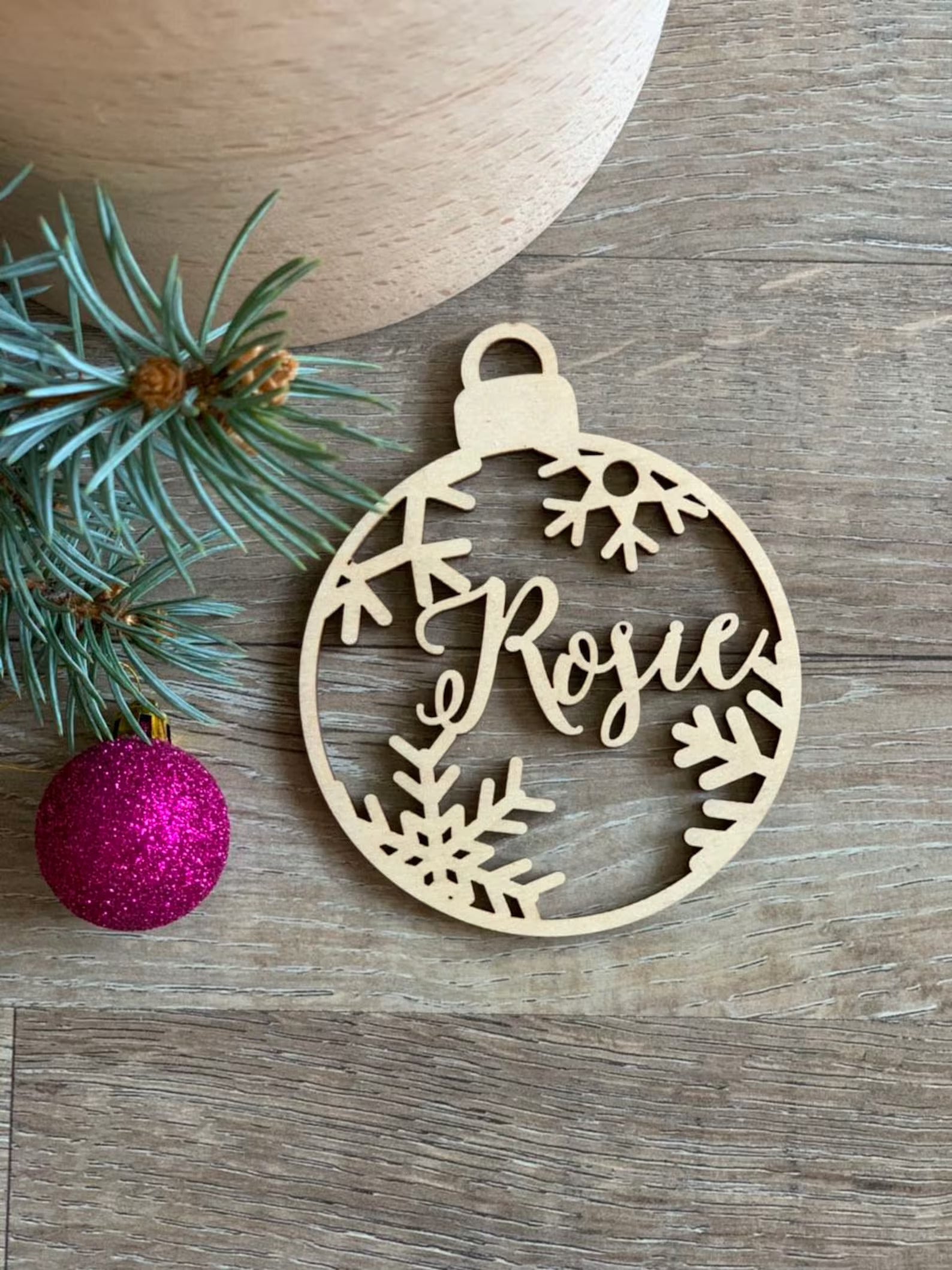 - 🎄 Laser-cut wood with intricate designs and customized with your name